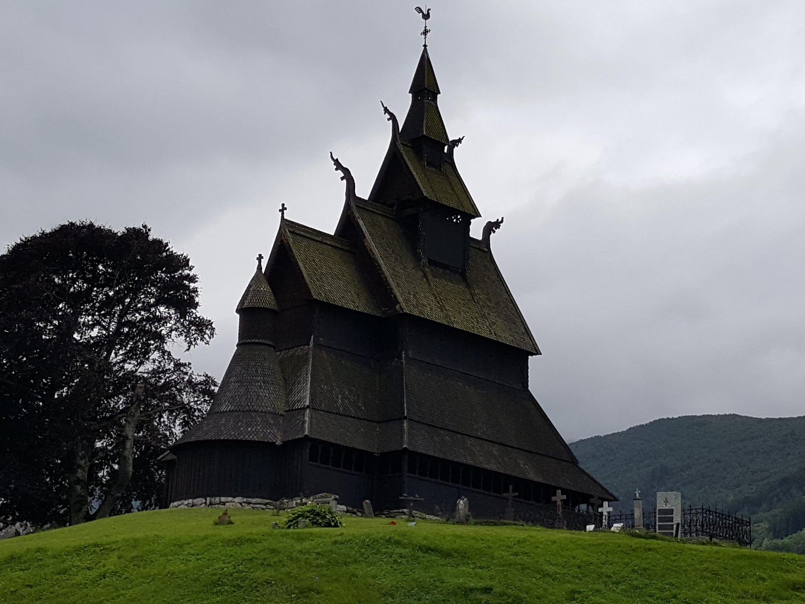 Wet, though not raining when we left Garmo, we had a short stop in Lom, to take in a fantastic wooden stave church. The back side smelt of burning and was blakened, so not sure if it has had a fire recently or not. A very impressive structure but again they wanted £7 to go inside! No thanks.